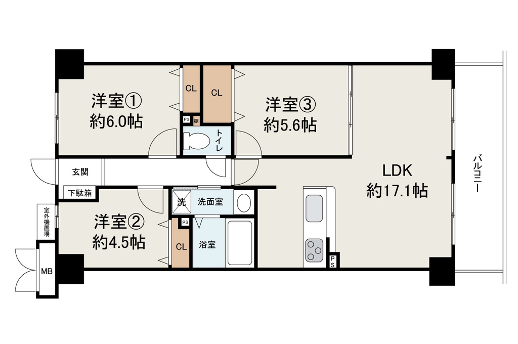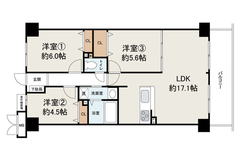 - 約17.1帖のLDKが魅力の、全居室洋室&収納付き3LDK!